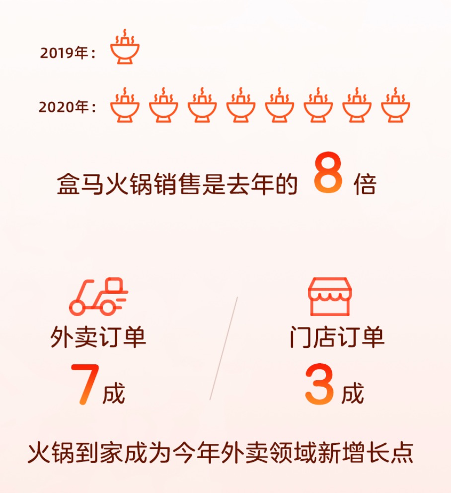吃火锅的方式变了!今日,盒马发布火锅报告显示:2020天猫双11期间,火锅销量是去年的8倍,7成订单来自线上外卖。