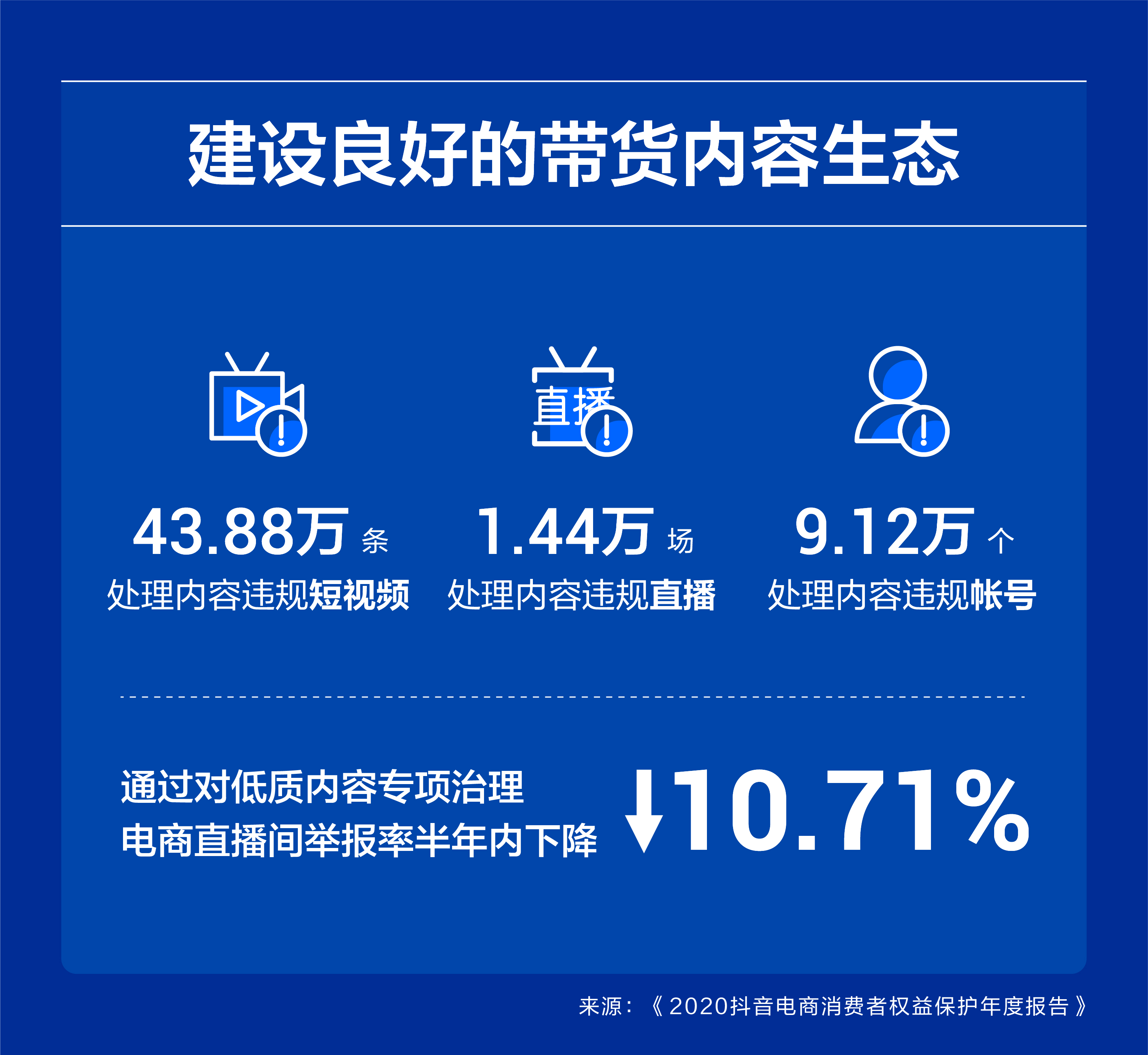 抖音电商在年报中明晰,良好的带货生态是内容电商可持续发展的根基,其对低质内容进行了专项治理,电商直播间举报率在半年内下降了10.71%。截至去年年底,该平台累计处理内容违规短视频43.88万条、内容违规直播1.44万场、内容违规帐号9.12万个。