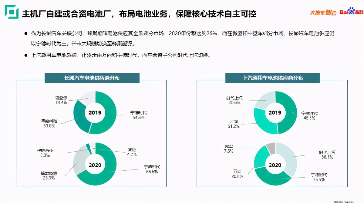 电池行业头部效应显著,但随着日韩系电池厂商站稳脚跟,国内“一家独大”的市场格局将正面临重构,2020年宁德时代和比亚迪份额遭遇重挫下降,LG化学份额提升,并且二线电池企业迅速崛起。主机厂为了降低企业经营成本和风险,一方面新增外部电池配套厂商,另一方面自建或合资电池厂,布局电池业务,保障核心技术自主可控。