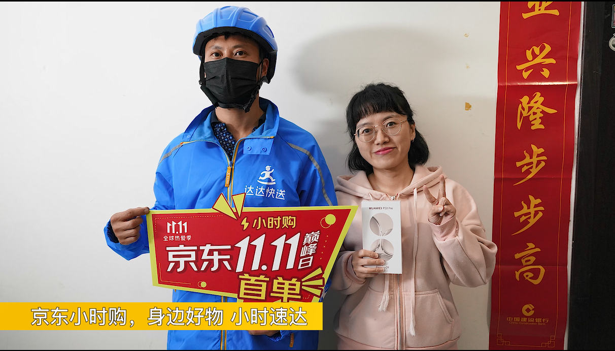 11月10日晚8点,京东11.11巅峰日正式开启。巅峰日开启仅7分钟,家住北京朝阳区的唐女士就收到了她通过京东“小时购”购买的华为P50 Pro手机。这也是京东小时购11.11巅峰日开启后的配送首单。