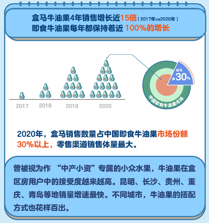 被誉为“森林黄油”的牛油果,曾被视为“中产小资”的专属。不会挑、不会吃,导致它的市场接受度不高。盒马从2018年全面上架即食牛油果,让用户买到熟度刚刚好的果实,销量逐年增长。