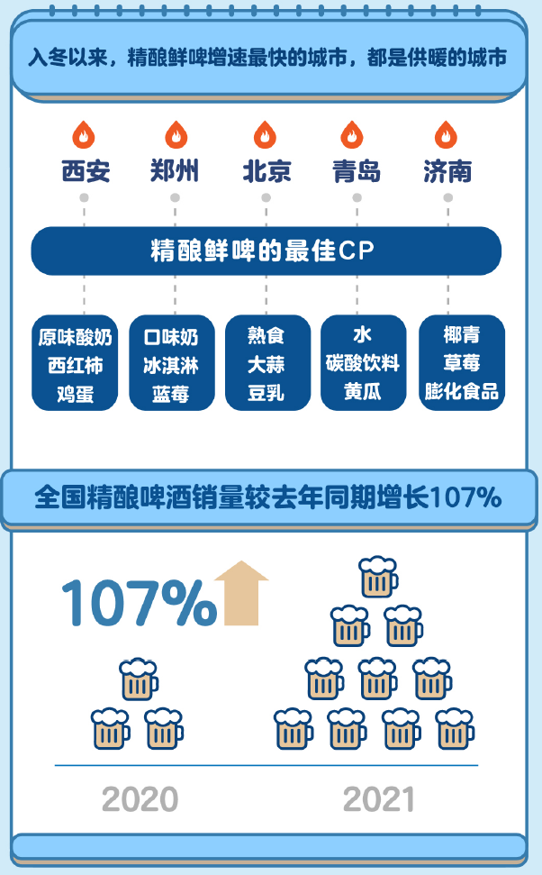 入冬以来,盒马精酿鲜啤增速最快的城市分别西安、郑州、北京、青岛、济南。外面大雪纷飞,屋内温暖如春,炖上地椒羊肉火锅,配上凉爽的鲜啤,谁敢说这不叫“懂生活”。