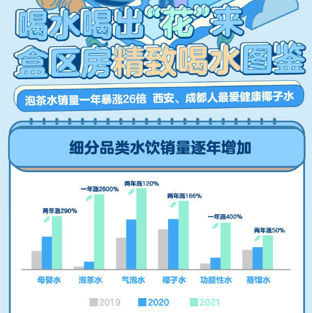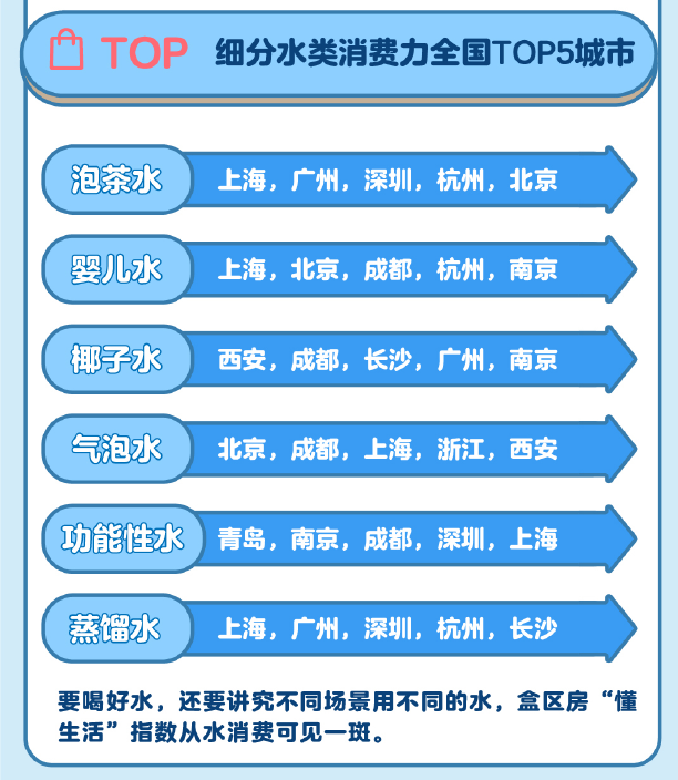 盒区房用户们喝水也不将就——不同场景要搭配不同种类的水,例如健身人士要喝椰子水、宝宝要喝婴儿水、泡茶、居家美容也有专门的水。