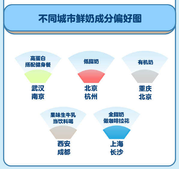 与此同时,不同城市对喝奶的偏好也不同,在上海和长沙,用户喜欢购买全脂奶用于咖啡拉花;武汉和南京则偏爱高蛋白牛奶,有助于健身增肌;爱吃的西安则钟爱果味生牛乳,看来把奶当饮料喝,才是西安人的不二选择。