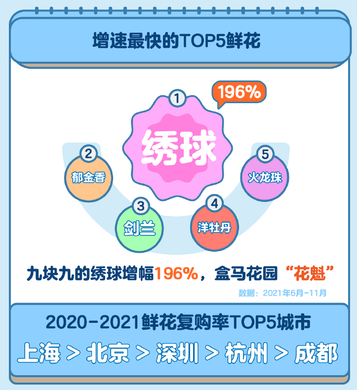 《报告》显示,洛神玫瑰、针垫花、重瓣百合、大花蕙兰等小众和进口花材,逐渐被大众所接受,成为“新晋网红”。今年被盒马带火的云南重瓣绣球,更是一跃成为盒马花园的当家“花魁”。