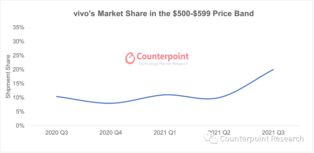 其中,vivo 9月份在中高端市场的份额翻了一番,而这主要归功于其在细分市场的产品组合规划。Counterpoint分析师Ivan Lam表示:“过去一年,vivo在中国中高端领域取得了重大进展。其在500美元至 599 美元价格区间的市场份额已从2020年9月的10%上升至2021年9月的20%。这是受到9月份vivo推出的X70 Pro强劲表现的推动。vivo仍在继续推高其价值链,通过在相机技术的研究和创新方面不懈努力,包括与光学技术领导者蔡司建立战略合作伙伴关系。”