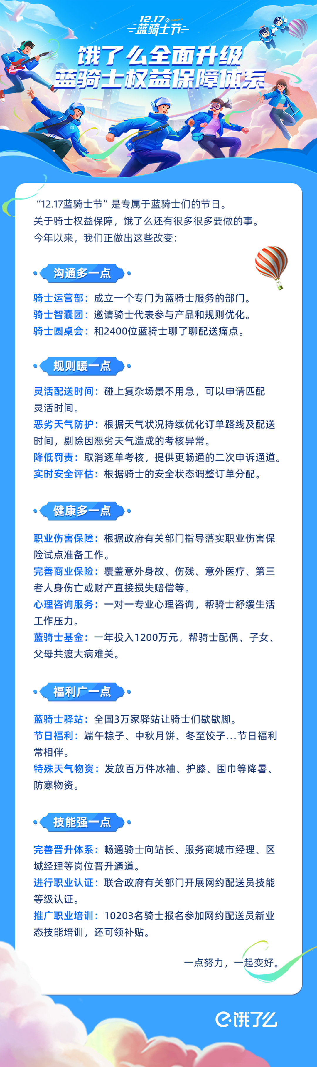 12月17日是“第四届蓝骑士节”,也是专门为蓝骑士打造的节日。饿了么宣布全面升级骑士保障体系,试点智能头盔、匹配灵活配送时间、扩宽骑士晋升通路,并将投入1200万元为骑士家人提供大病帮扶金。